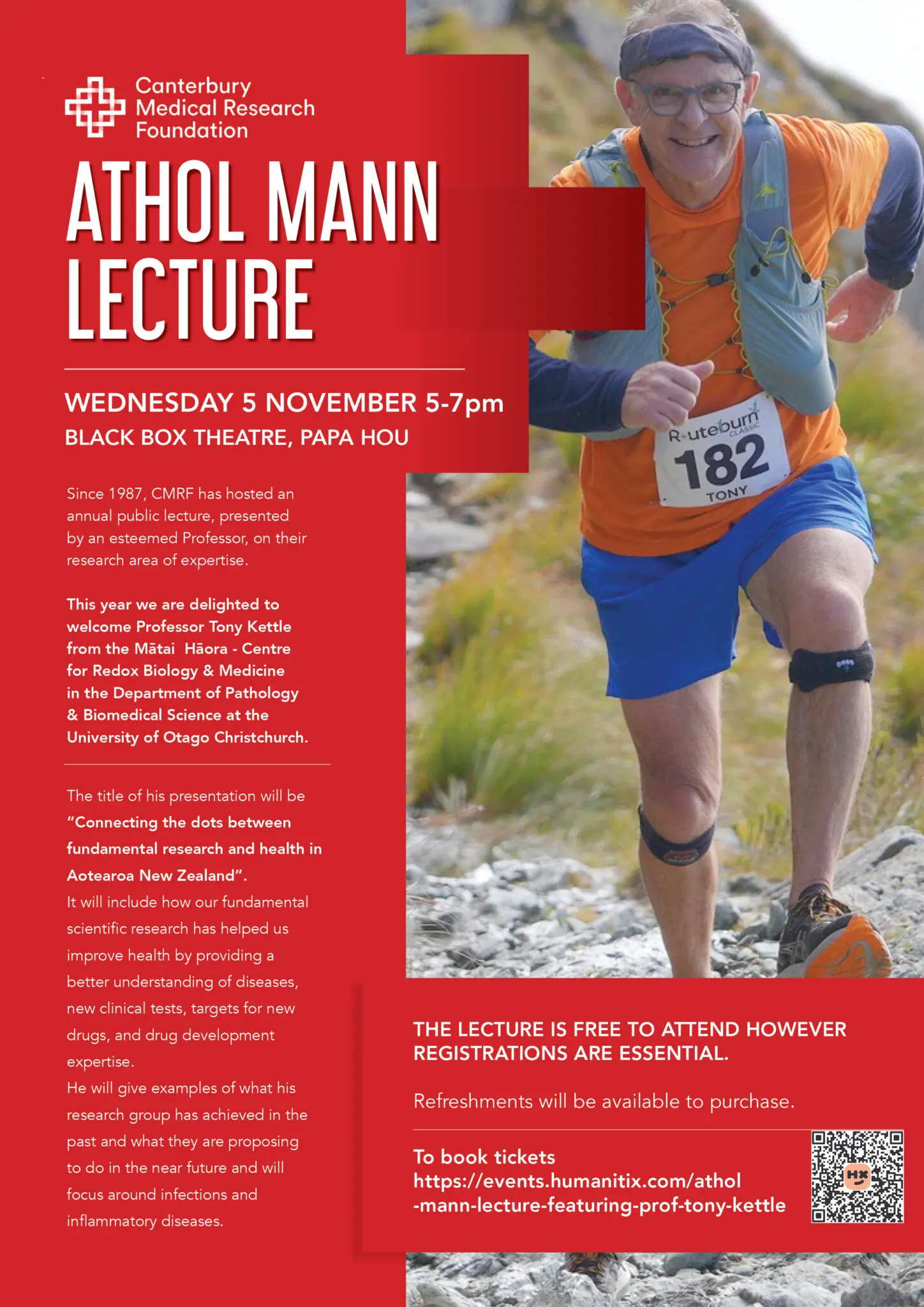 Since 1987, CMRF has hosted an annual public lecture, presented by an esteemed Professor, on their research area of expertise. This year we are delighted to welcome Professor Tony Kettle from the Mātai Hāora – Centre for Redox Biology & Medicine in the Department of Pathology & Biomedical Science at the University of Otago Christchurch.